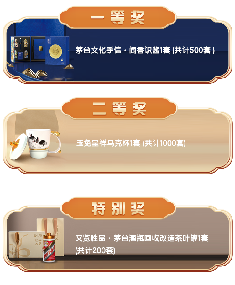 同時(shí),小(xiǎo)茅将在i茅台APP開(kāi)展滿額抽好禮活動,期待您的參與。12月2日9:00-12月20日18:00,在“i文創”購買任意文創産品累計(jì)滿688元(不含郵費)并完成交易的用戶,将有(yǒu)機會(huì)抽取小(xiǎo)茅為(wèi)您準備的精美禮品。獎品設置具體(tǐ)如下: