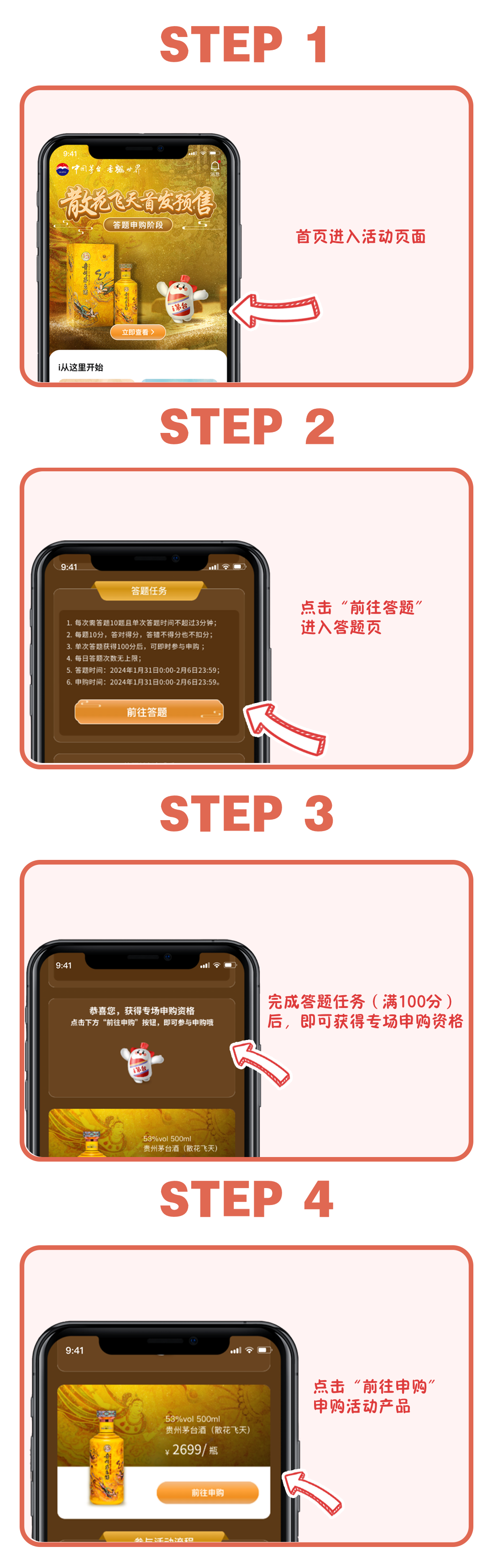 經過小(xiǎo)茅精心籌備,飛天文化系列之散花(huā)飛天線上(shàng)首發預售活動即将開(kāi)啓答(dá)題申購!凡在該活動意向報名階段完成報名的親,可(kě)于1月30日10:00-2月1日22:00進入活動頁面點擊“前往答(dá)題”,參與9999瓶散花(huā)飛天申購答(dá)題任務,單次答(dá)題獲得(de)100分就能即時(shí)申購2699元/瓶的散花(huā)飛天!