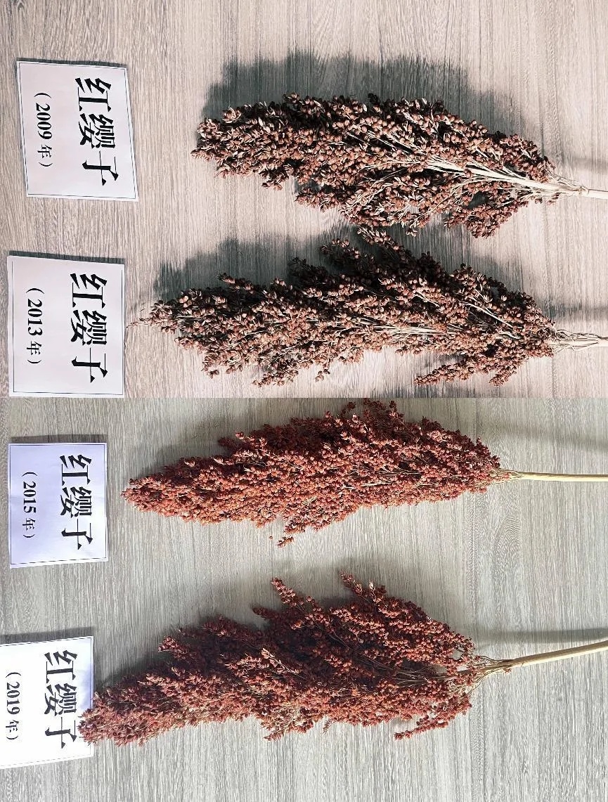 上(shàng)圖為(wèi)2009和(hé)2013年的紅纓子糯高(gāo)粱;下圖為(wèi)2015和(hé)2019年的紅纓子糯高(gāo)粱。經過育種技(jì)術(shù)改良的紅纓子糯高(gāo)粱,産量提升的同時(shí),品質也不斷提升。