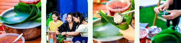 現場(chǎng)洋溢着濃厚的節日氛圍,糯米、粽葉、蜜棗、棕繩等所需材料一應俱全,整齊地擺放在桌子上(shàng)。大(dà)家(jiā)剪棉線、卷粽葉、填餡料、壓實、封口、紮緊……巧手翻飛、粽葉舞動、彩繩穿梭。