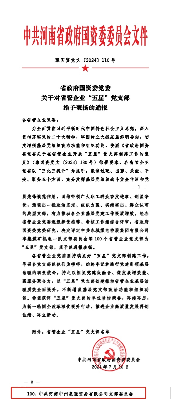 喜報||河南鈣源貿易有限公司黨支部被省政府國資委黨委評定為(wèi)“五星”黨支部并予以通(tōng)報表揚