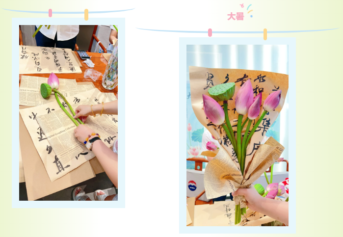 活動現場(chǎng),荷花(huā)芬芳四溢,翠綠荷葉滿目,桌上(shàng)筆墨紙硯整齊擺放。大(dà)家(jiā)提筆蘸墨,旋即沉浸于書(shū)法的奇妙世界。書(shū)法創作(zuò)完畢,精心挑選自己心儀的荷花(huā),将它們包紮成美麗(lì)的花(huā)束,一束束充滿自然之美與藝術(shù)氣息的荷花(huā)花(huā)束便應運而生(shēng)。書(shū)法與手工藝術(shù)巧妙結合,讓每一束荷花(huā)都成為(wèi)獨一無二的藝術(shù)品。