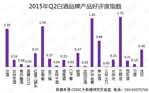第二季度各白酒品牌産品好評度指數(shù)差距明(míng)顯,從總體(tǐ)來(lái)講,消費者的好評仍舊(jiù)圍繞着五糧液、泸州老窖、汾酒以及劍南春等市場(chǎng)占有(yǒu)率較高(gāo)的白酒品牌,其中五糧液的産品好評度最高(gāo),成績超過一季度時(shí)的榜首泸州老窖。據了解,五糧液從去年開(kāi)始籌劃“互聯網+”,已與酒仙網和(hé)京東建立了戰略合作(zuò)關系,并針對線上(shàng)渠道(dào)推出了專門(mén)産品。此外,五糧液還(hái)将建立一支專業的電(diàn)商團隊,逐步實現電(diàn)商渠道(dào)的戰略定位,開(kāi)發專屬電(diàn)商渠道(dào)的産品,注意維護價格體(tǐ)系。而成績緊随其後的泸州老窖也開(kāi)始升級合作(zuò)的态度,在公司內(nèi)部成立電(diàn)商公司獨立組織架構,開(kāi)發專供線上(shàng)的酒品。從兩個(gè)品牌的好評度成績來(lái)看,線上(shàng)專供産品似乎更能得(de)到消費者的青睐。如下圖所示: