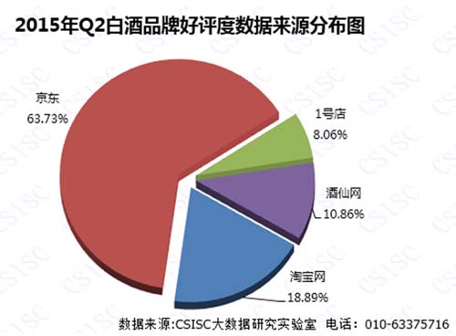 如圖所示,2015年二季度白酒行(xíng)業監測品牌的消費者好評主要來(lái)自于電(diàn)商平台淘寶天貓、京東商城、酒仙網以及一号店(diàn)。其中,在京東商城監測到的好評數(shù)量最多(duō),占總體(tǐ)的63.73%,其次是淘寶天貓,占比18.89%,酒仙網平台的好評數(shù)量占比相對較少(shǎo),1号店(diàn)最少(shǎo),占比8.06%。如下圖所示: