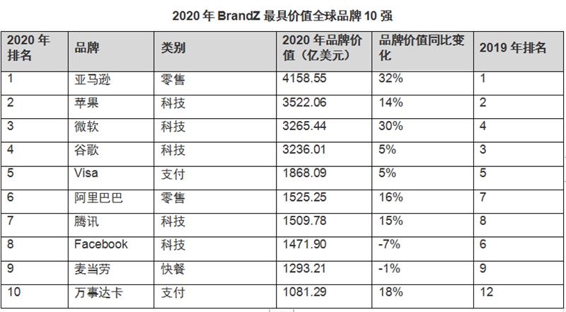 WPP與凱度今天聯合發布的“2020年BrandZ最具價值全球品牌100強”排行(xíng)榜顯示,全球排名前100名的品牌價值合計(jì)突破了5萬億美元大(dà)關,約等于日本的全年GDP。排名前十的全球品牌分别是亞馬遜、蘋果、微軟、谷歌(gē)、Visa、阿裏巴巴、騰訊、Facebook、麥當勞、萬事達卡。