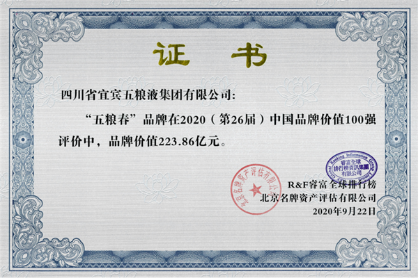 9月22日,由睿富全球排行(xíng)榜資訊集團與北京名牌資産評估公司共同編制(zhì)的2020(第26屆)中國品牌價值報告發布, 報告揭曉了《中國品牌價值100強》。五糧液以2276.98億元人(rén)民币的品牌價值位列第三,連續26年穩居白酒制(zhì)造類第一品牌。五糧春、五糧醇分别以223.86億元和(hé)159.08億元的品牌價值位列榜單第35位和(hé)49位。