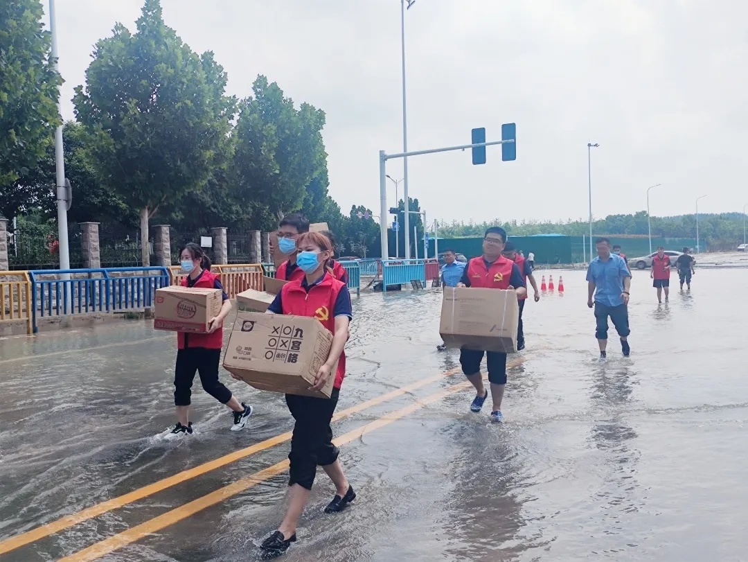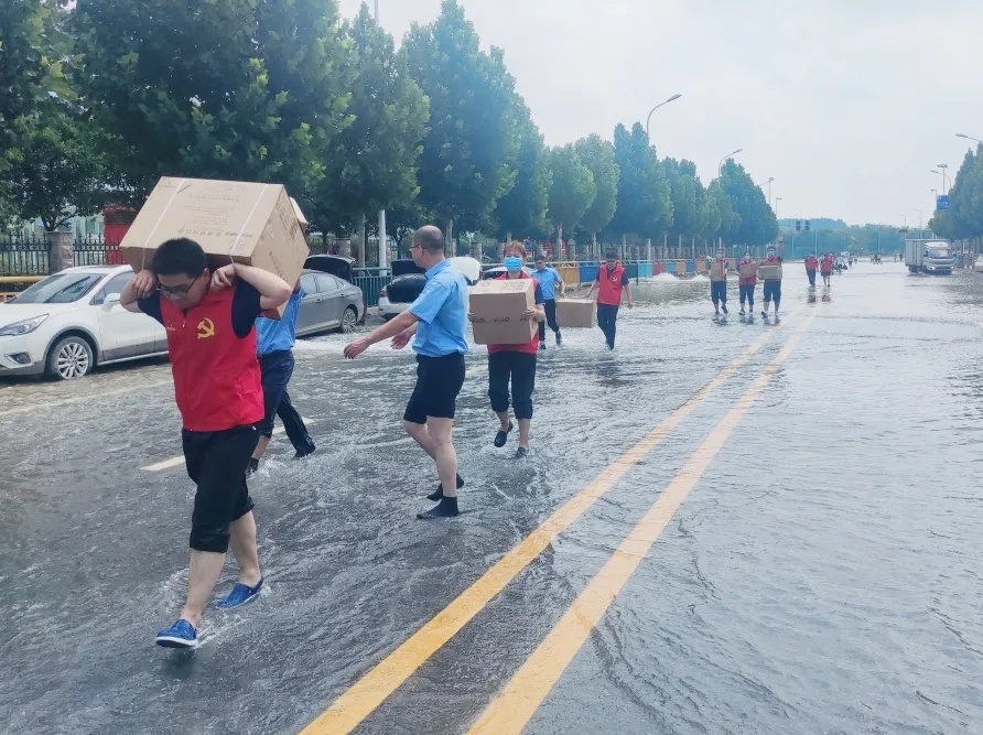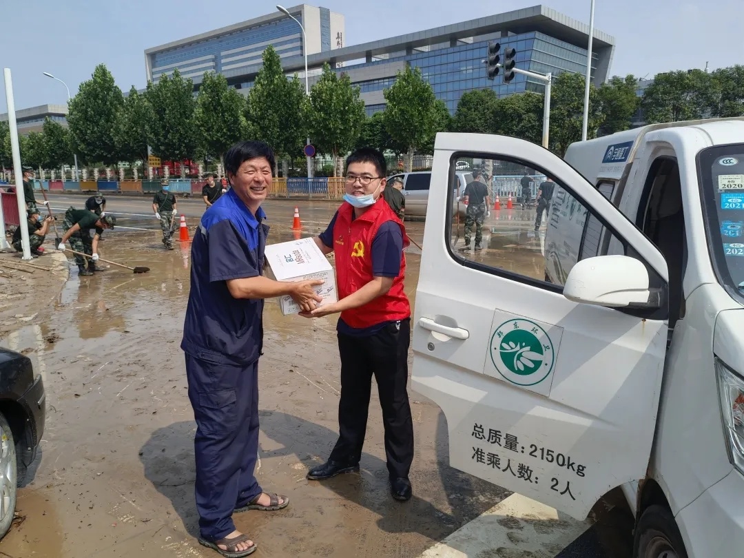 7月24日上(shàng)午,河南鈣源貿易有限公司組織黨員職工趕赴中牟阜外醫(yī)院捐贈物資、助力抗災,協助武警部隊官兵及醫(yī)護人(rén)員搬運物資、排水(shuǐ)清淤。