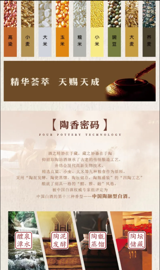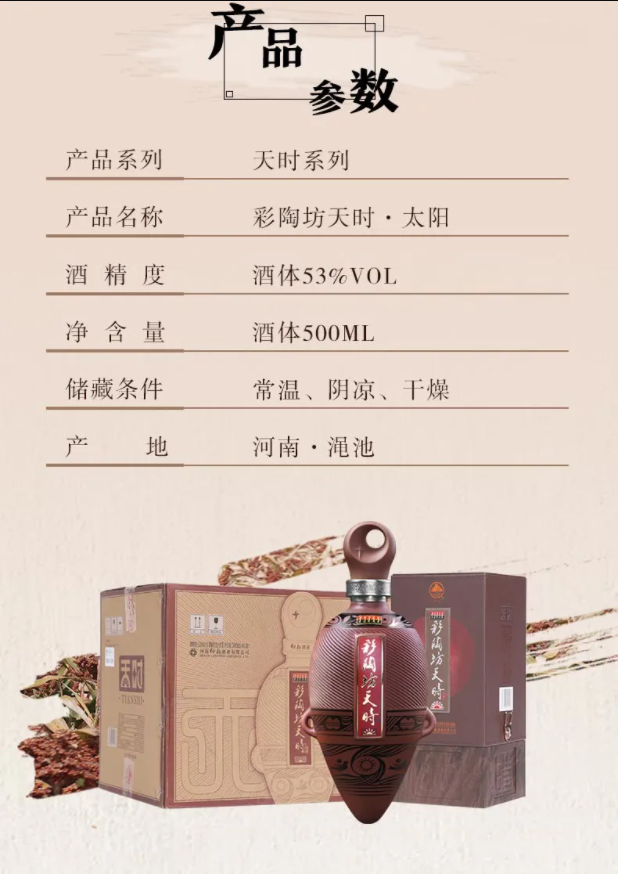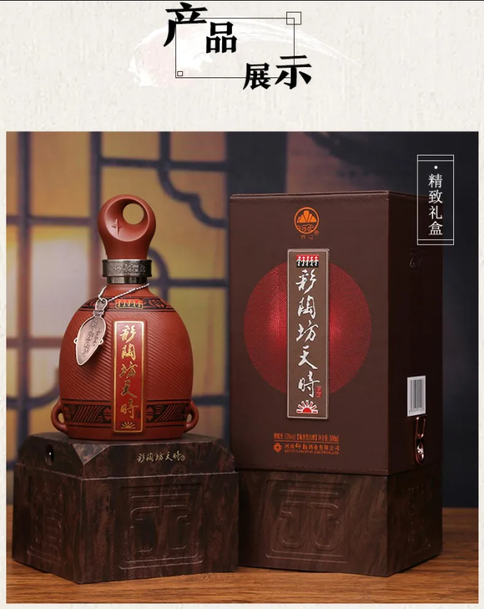 彩陶坊天時(shí) • 太陽采用仰韶彩陶的經典文物——小(xiǎo)口尖底瓶進行(xíng)盛裝,酒體(tǐ)是由九種糧食采用四陶工藝釀造而成,具有(yǒu)“一大(dà)一小(xiǎo)、一多(duō)一少(shǎo)、一長一好”的獨特風格,至少(shǎo)窖藏1800天,産量僅為(wèi)總産量的10%,彌足珍貴。